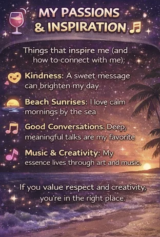 I love getting lost in a glass of fine wine and the sound of the ocean. My dream date starts with music on the beach at sunrise and ends in a sensual night under the moonlight, where I let my inner wolf come out to play. Are you looking for a real connection with a touch of midnight fire? You’re in the right place.